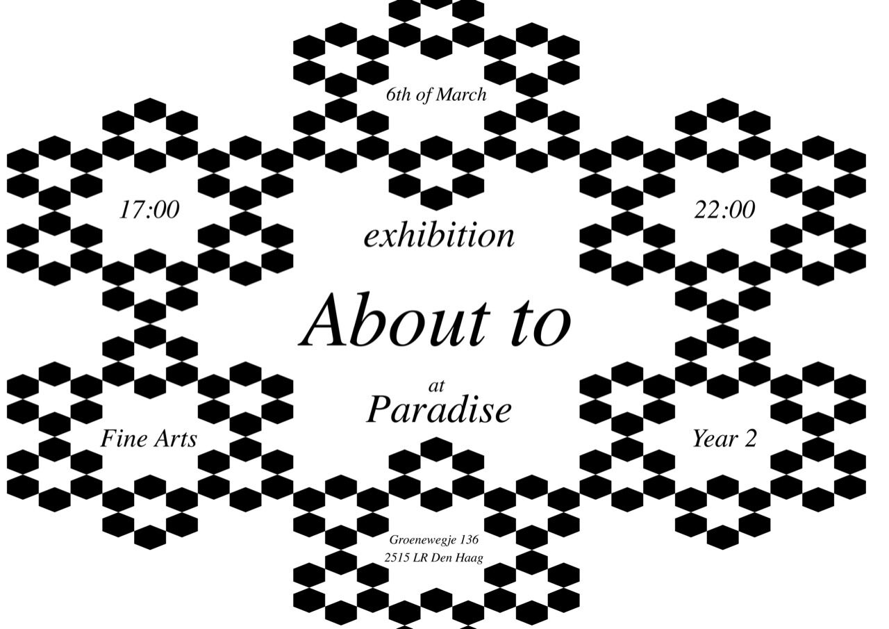 2nd-year Fine Arts students invite you to the opening of their exhibition "about to" taking place on Friday, March 6, in Paradise.