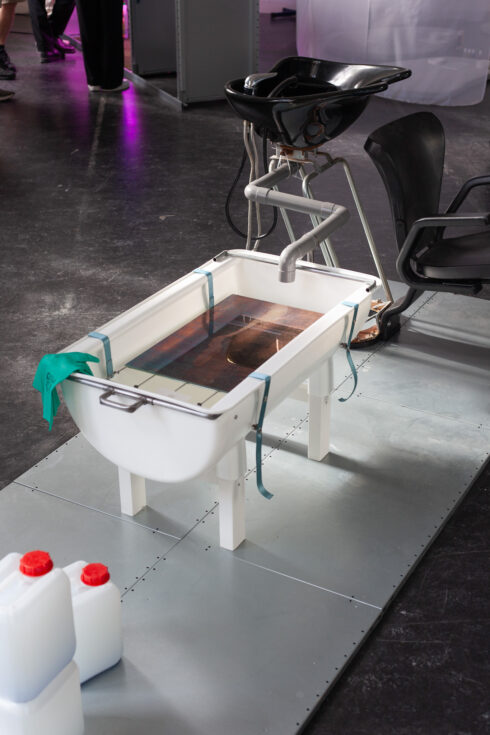 Draining Desire by Loena Visser is an installation that explores the conflicting interplay between beauty standards and their invisible toxicity. It aims to hold up a mirror – quite literally – to confront consumers, cosmetic companies, and designers with these socially constructed and industrially enforced frictions.