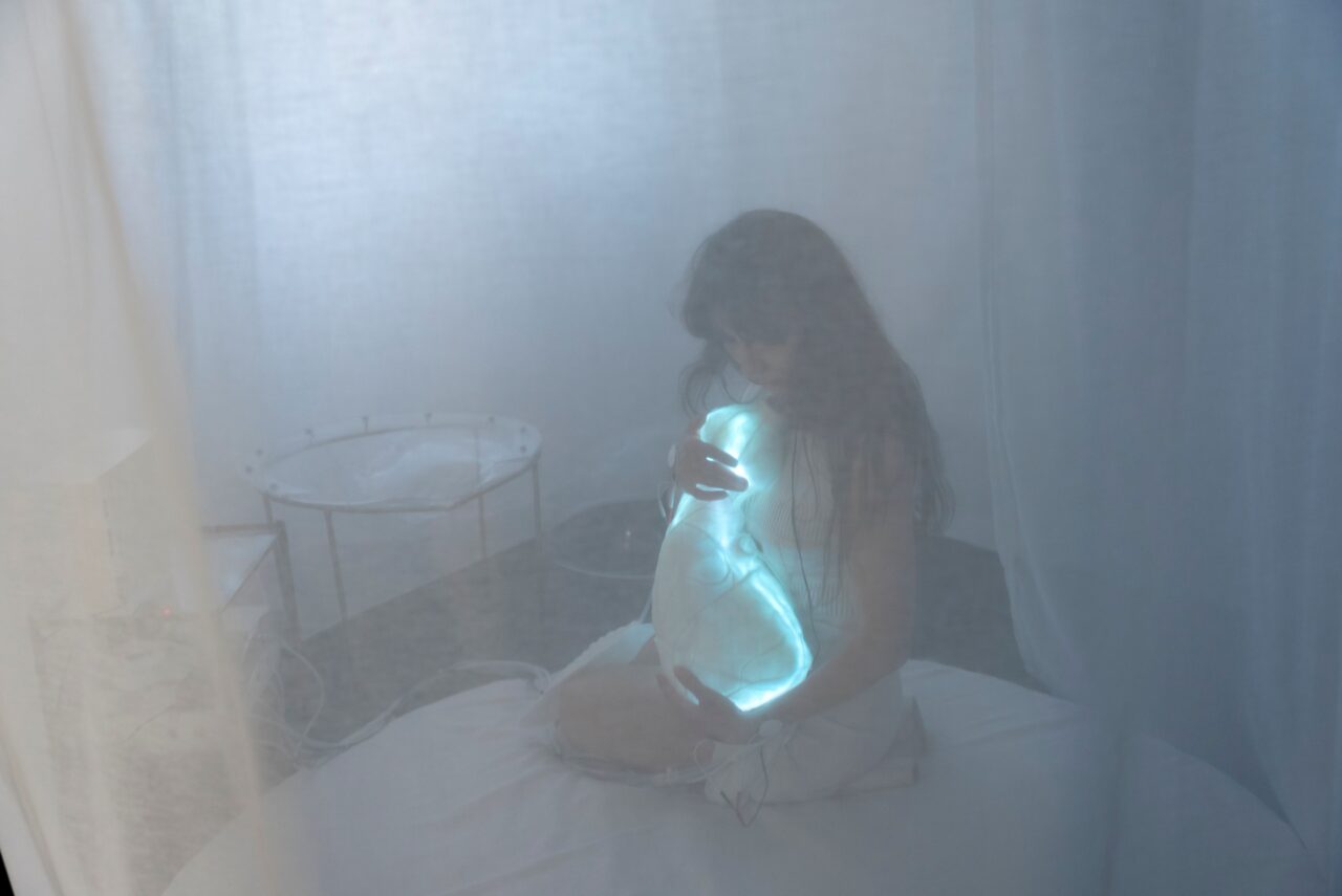 Interactive installation in which two people experience each other's heartbeat, breathing and temperature through responsive, wearable sculptures. Intimacy here arises precisely through separation. Without words or looks, direct contact becomes palpable through the rhythms of the body.