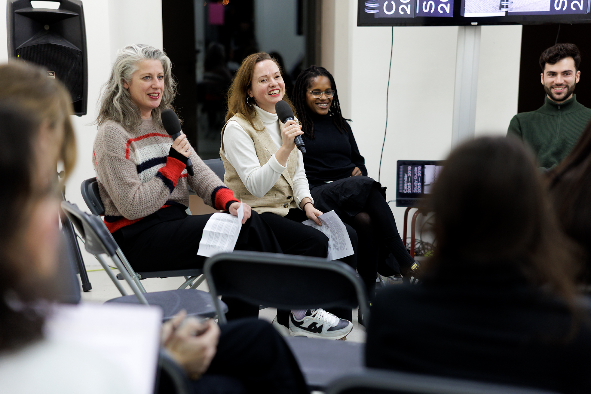 Sitting in the centre of a semi-circle of alum and students were Koos Breen (2014), whose practice lives in the intersections of art direction, design, and art; Donna van West (2015), who, after graduation, followed her passion for filmmaking and storytelling; Yessica Deira (2020), a maker, artistic researcher and DJ whose practice is as multi-layered as her music selection, Ocean Albin (2021), whose professional practice encompasses branding, motion, type, web, and editorial design, and Charlotte van Alfen (2022), an illustrator and graphic designer based in Rotterdam, who explores diverse visual languages and is currently expanding her practice into art direction.